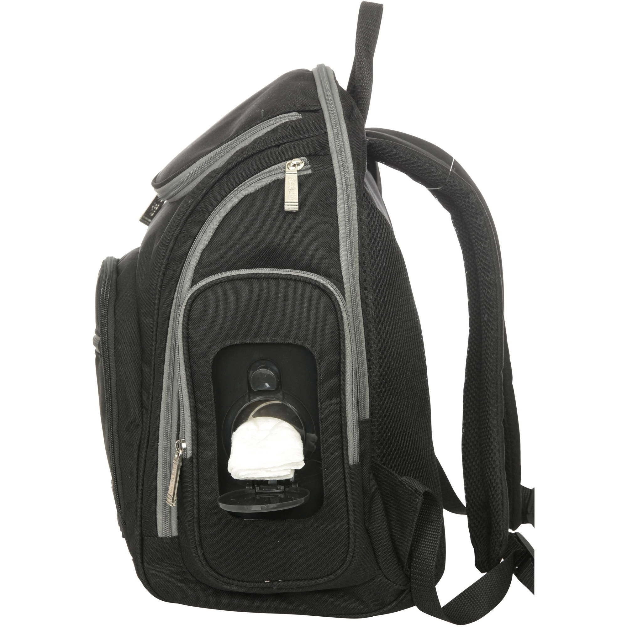 The Baby Boom Spaces and places backpack diaper bag is the ultimate in convenience and organization. The bag unzips to a large interior compartment, perfect for carrying diapers, clothing, toys, foods, and more. Then, in 11 separate pockets store smaller essentials, like pacifiers, bottles, or your wallet. A specially designed side pocket keeps the hard wipes case (included) in easy reach. Bottles store easily and safely in the exterior, insulated pocket, or interior pouches. The bag comes with a removable changing pad and accessory pouch for dirty duds. Easy to carry with padded backpack straps and a comfortable web backing.