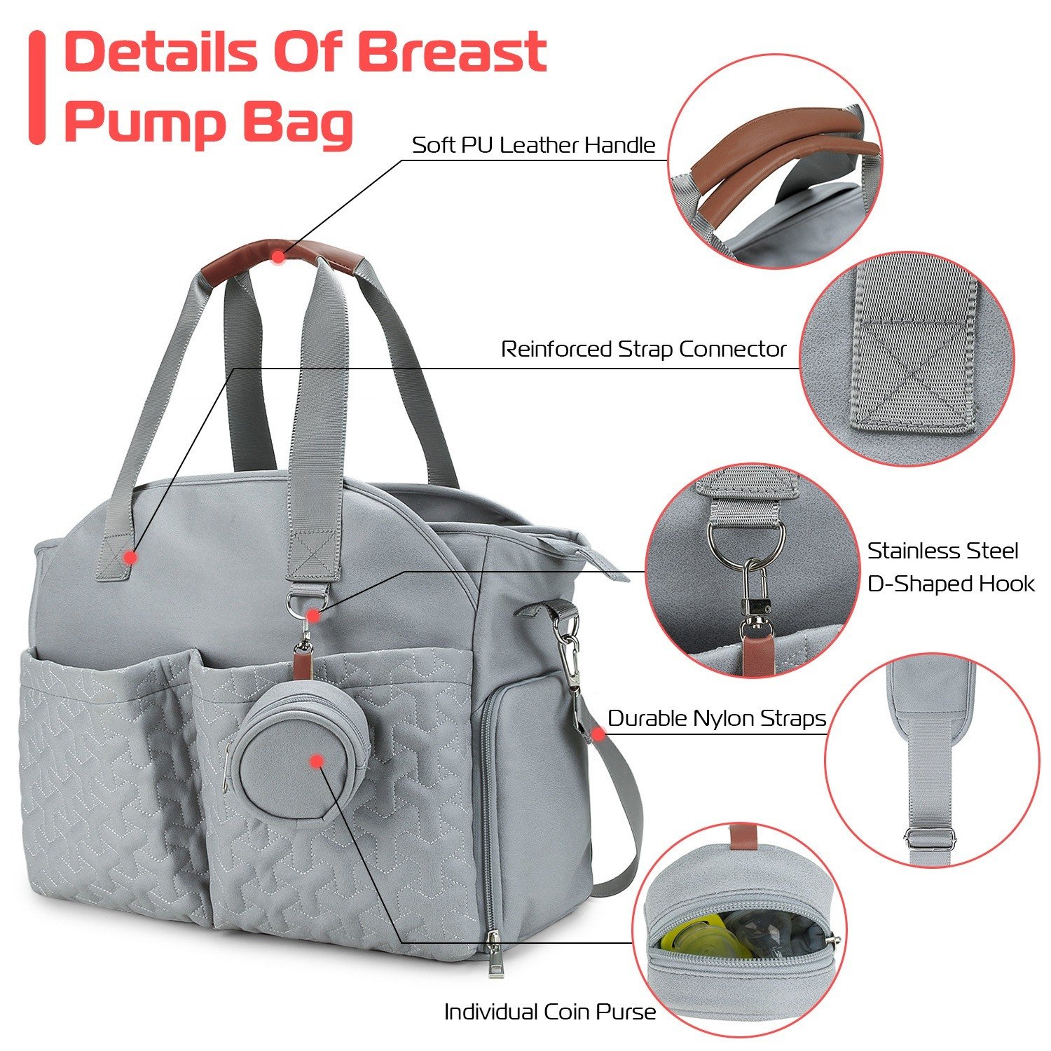 *Multiple Pockets*:Our breast pump bag is designed with multiple pockets. Include1 main compartment,5 extra open compartment pockets,2 side pockets and 1 individual coin purse. 5 layers of separation help you to organize your baby necessaries much more delicately.