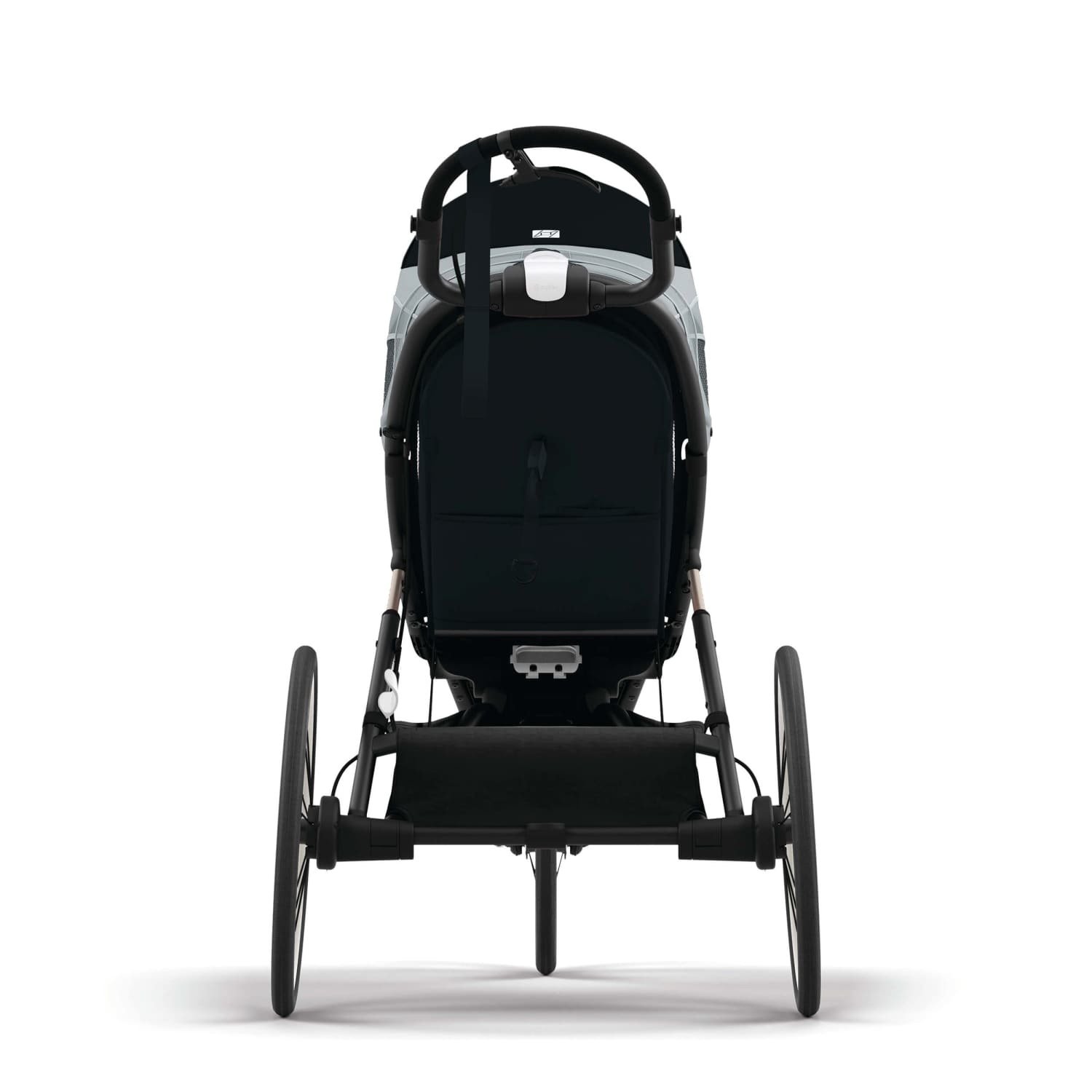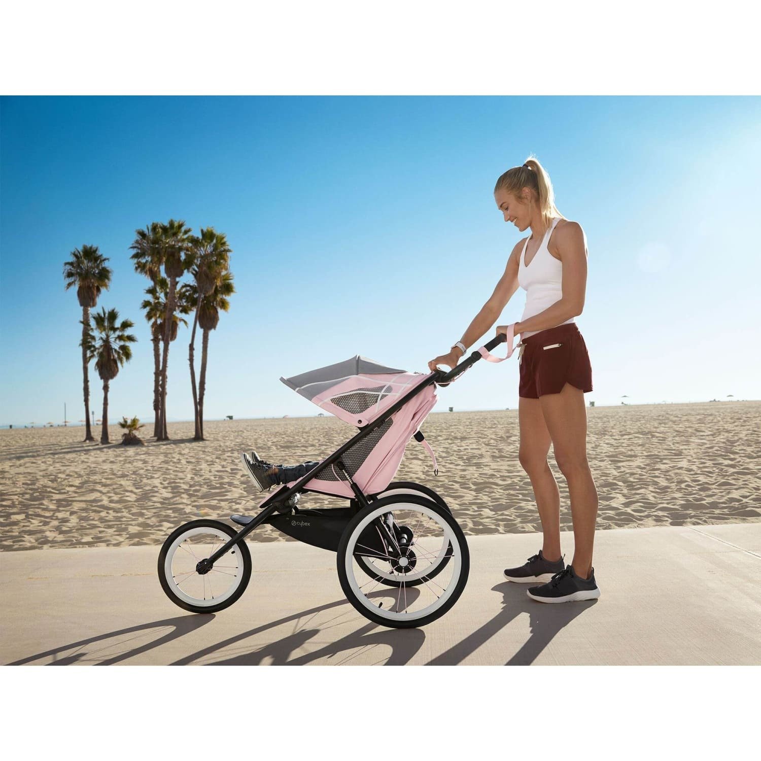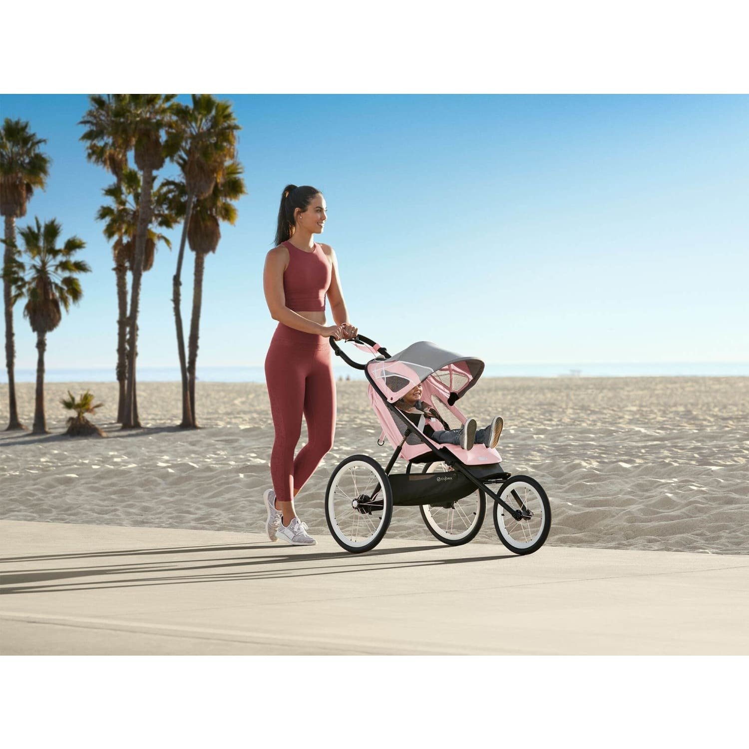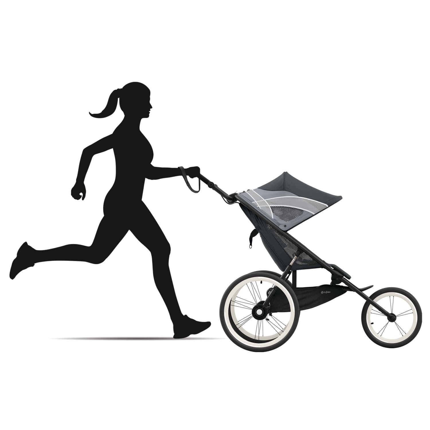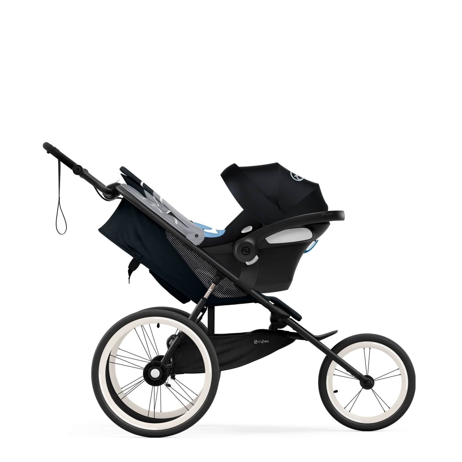 Designed for all your future runs with your child; the CYBEX AVI jogging stroller is lightweight and streamlined for excellent running performance in urban streets and leafy parks.The AVI: Giving you the freedom to exercise with the same passion and style that you bring to every other part of your life.Features:LIGHTWEIGHT: The lightweight aluminum frame and air-filled tires make each run incredibly smooth and liberatingEXCELLENT RUNNING PERFORMANCE: Stay on track with the AVI's lightweight aluminum frame; 20' rear wheels and a front wheel that's fixed for extra stability. The jogging stroller is also designed to allow a full range of motion for your stride so you can enjoy the best running experienceULTRA-COMPACT FOLD: Within seconds; the AVI can be folded into an ultra-compact package using just one hand for convenient storage in most trunks. All wheels are easily removed with no tools required; for an ultra-compact folded size of 35' x 23' x 9.8'REAR SUSPENSION AND AIR-FILLED TIRES: Air-filled tires keep the ride smooth while soft rear suspension absorbs all the bumps of the road—greater freedom for you and exceptional comfort for your childONE-HAND RECLINE: The reinforced backrest keeps your child comfortable and secure while the infinite recline settings lets them sit back and relaxADJUSTABLE; SILICONE HANDLEBAR: The rounded handlebar shape is ergonomically designed for efficient steering and can be adjusted to fit your height. It can be steered with one hand; leaving your other arm free to swing naturally for effortless running. The silicone grip is not only slip-proof; but also shock-absorbing and comfortable to hold even during longer runsHANDBRAKE: The handbrake helps vary the stroller speed to meet your paceTETHER STRAP: Attached to the handlebar for additional safetyXL SUN CANOPY WITH MESH WINDOW: An XL sun canopy made of UPF50+ protective fabric shields your child from the sun and includes a visor and a mesh window enabling you to check on your child without taking a breakAIR VENTILATION: Mesh windows in the canopy and the sides of the seat offer healthy air ventilation and cooling air circulation on hot daysREFLECTIVE DETAILS: Reflective details provide extra visibility during dusk or dawn. When illuminated; they help you stand out and stay safe whenever you choose to runCONVENIENT STORAGE OPTIONS: The back pocket is the perfect place to stow small items and includes a special compartment for your smartphone. For the rest of your essentials; the spacious cargo basket can carry up to 11 lbs.TRAVEL SYSTEM: The AVI is compatible with our award-winning CYBEX infant car seats (car seat adapters sold separately). Note: the AVI should be used at a gentle walking pace when a car seat is attached.Only use in jogging mode with children at least 9 months old and who can sit up unassisted.Includes: Jogging stroller frame and seat packAvailable accessories: car seat adapters; 2-in-1 cup holder; rain cover; insect net