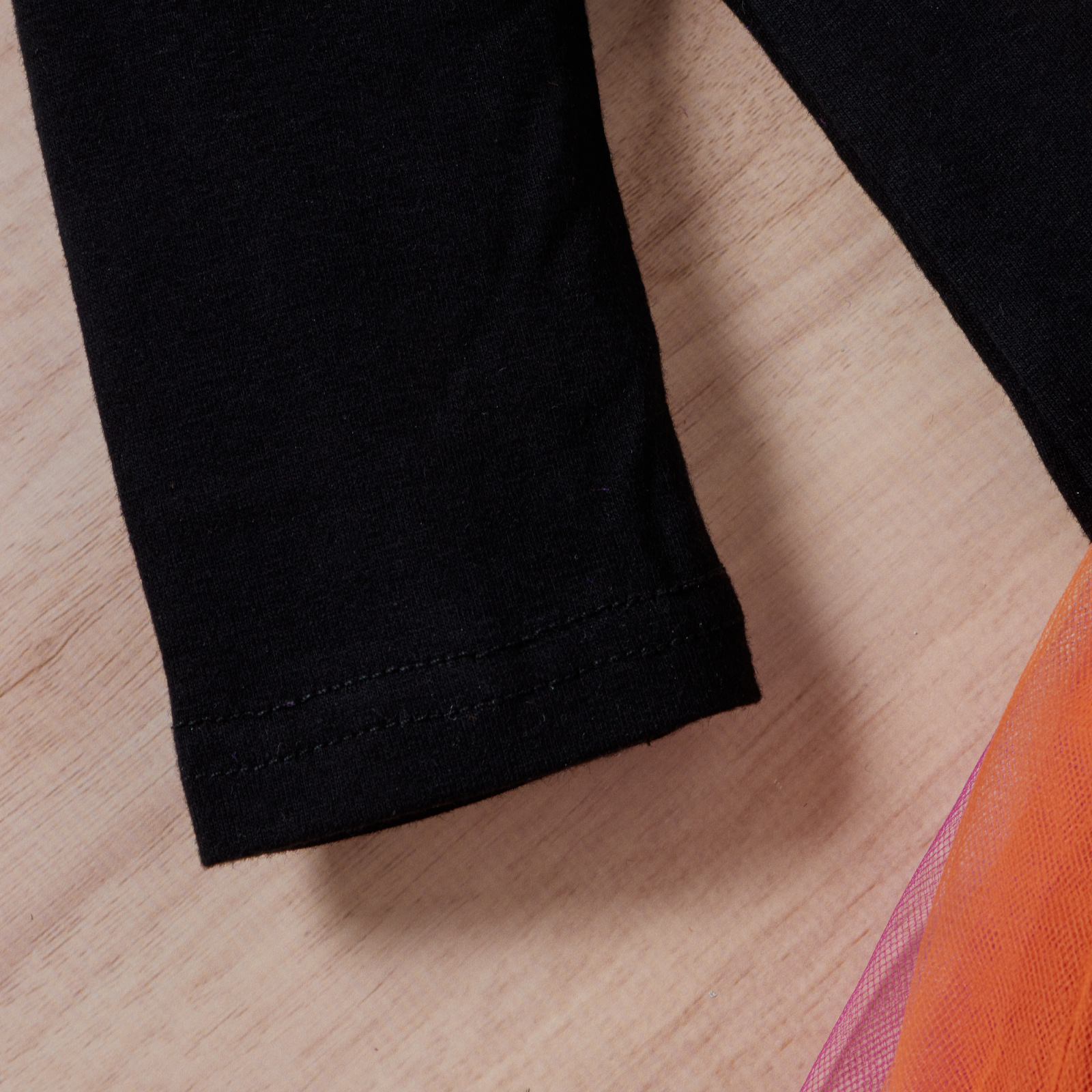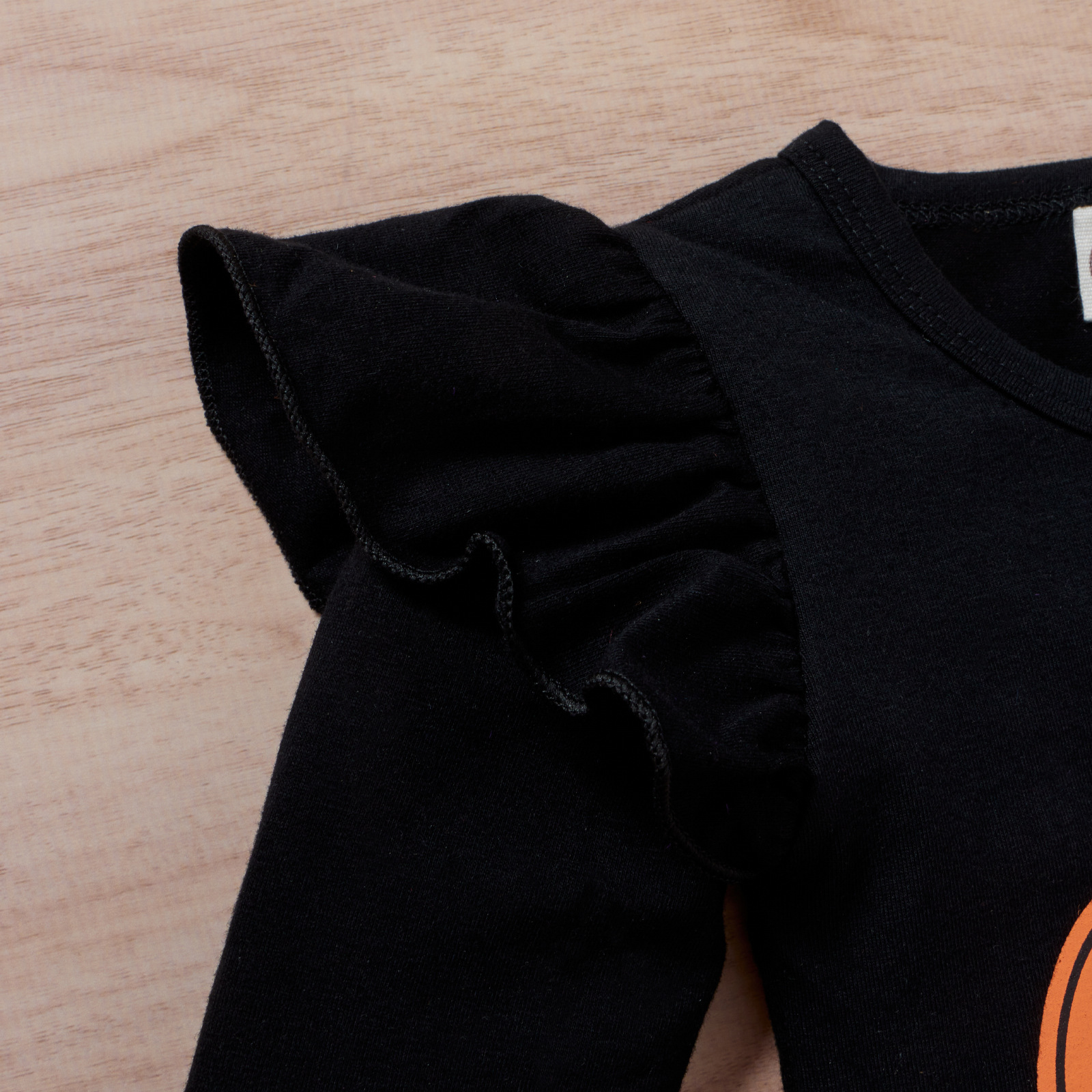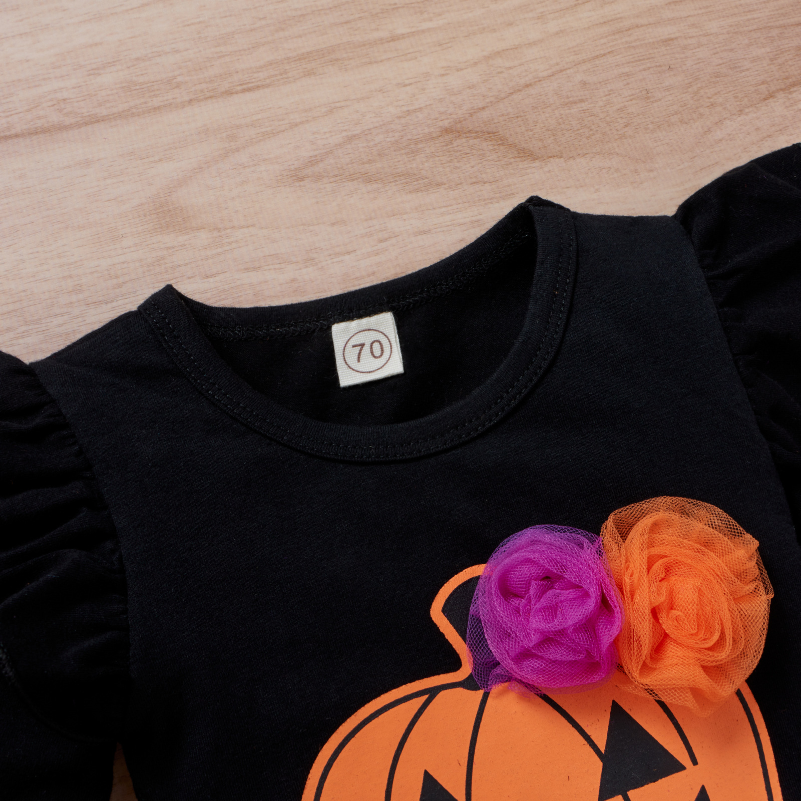 Girls' Halloween Black Romper Printed Smiley Face Pumpkin Mesh Skirt Three-piece Set