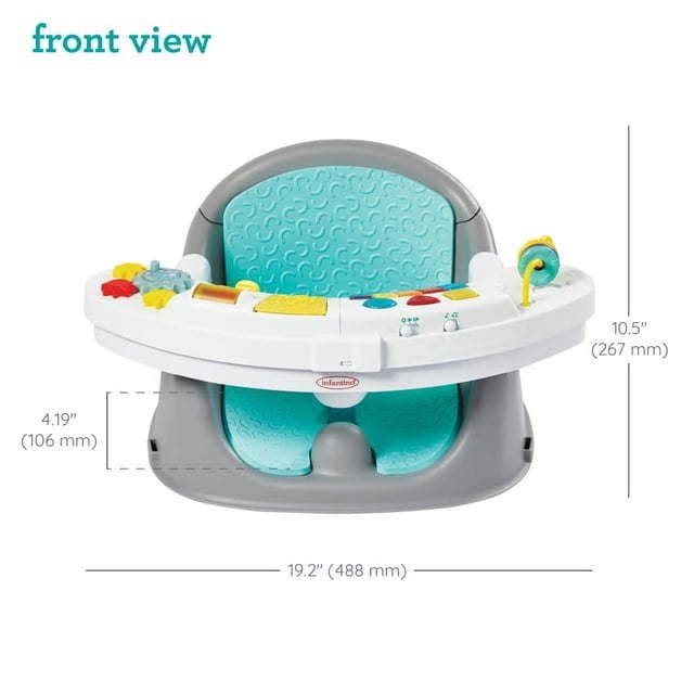 The Infantino Music & Lights 3-in-1 Discovery Seat & Booster is an interactive play place, snack-time seat, and secure booster all in one. Support early sitters in seat positioner mode, while keeping them happily engaged with 6 fun activities including a light up piano with 20 songs & sounds. Stimulating play pods encourage sensory development and help build fine motor skills, and are removable for floor play or on-the-go fun. When your little one is ready for a snack, slide the toy pods apart to reveal a meal time tray with cup holder. Convenient security straps allow the booster seat to easily attach to a kitchen chair, and the soft foam seat is comfortable for baby and easy to wipe clean after mealtime. At Infantino, we believe every baby deserves access to quality products, this is why we design our products to be unisex so all little ones can enjoy them!