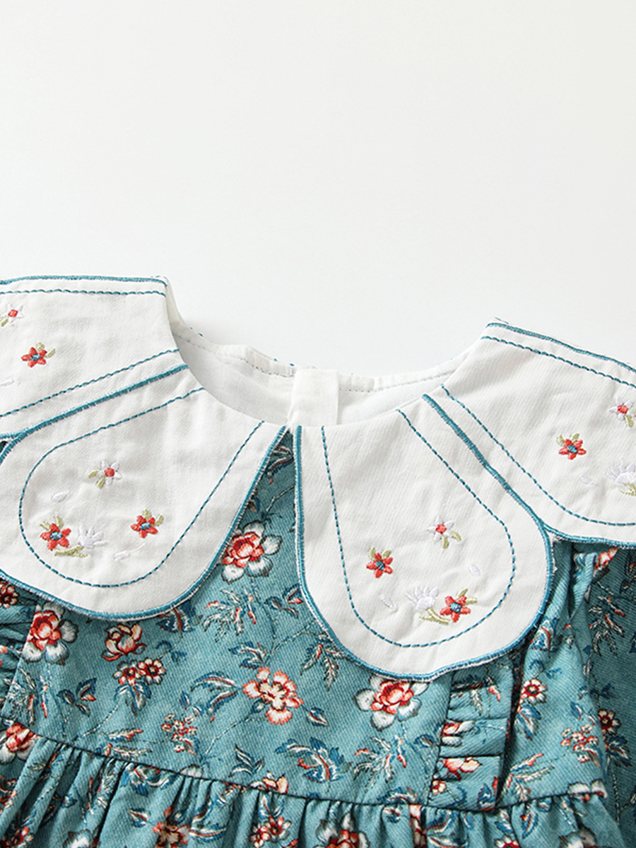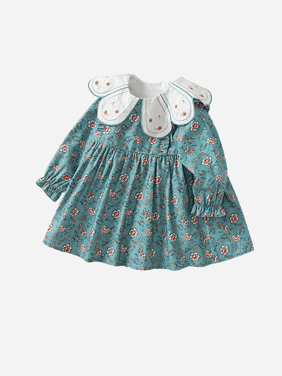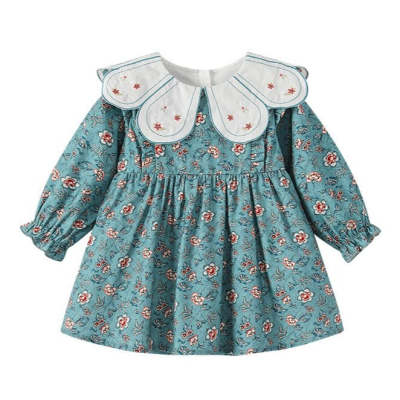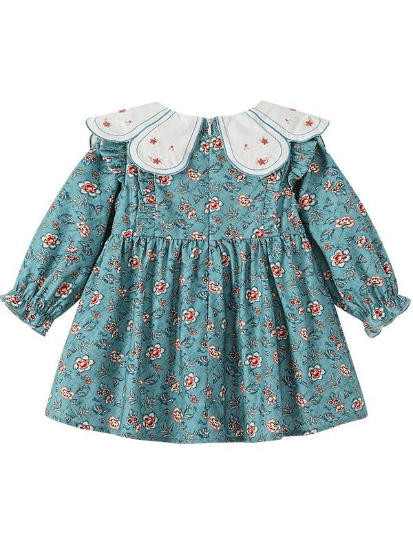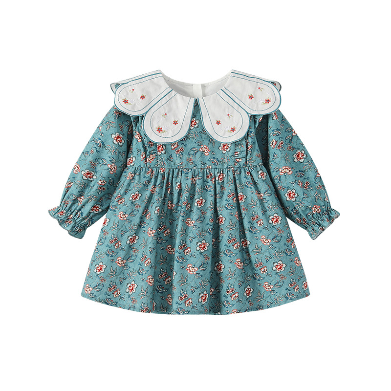 Peacock Blue Girl Floral Autumn Baby Girl Petal Collar Princess Dress Children's Clothing
