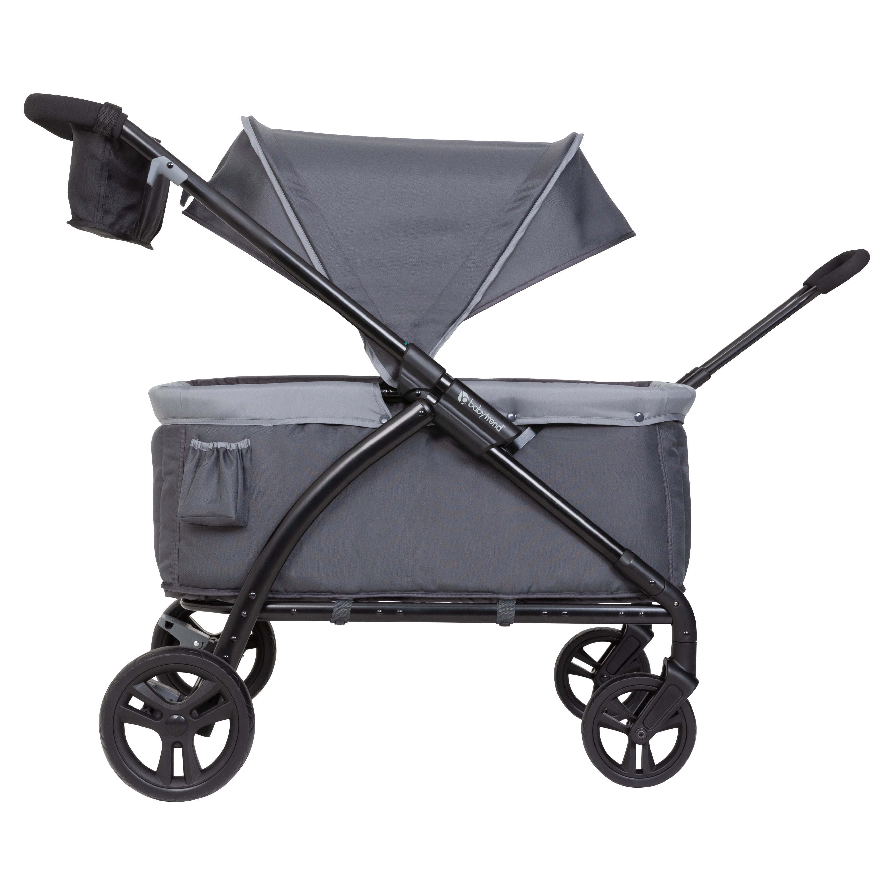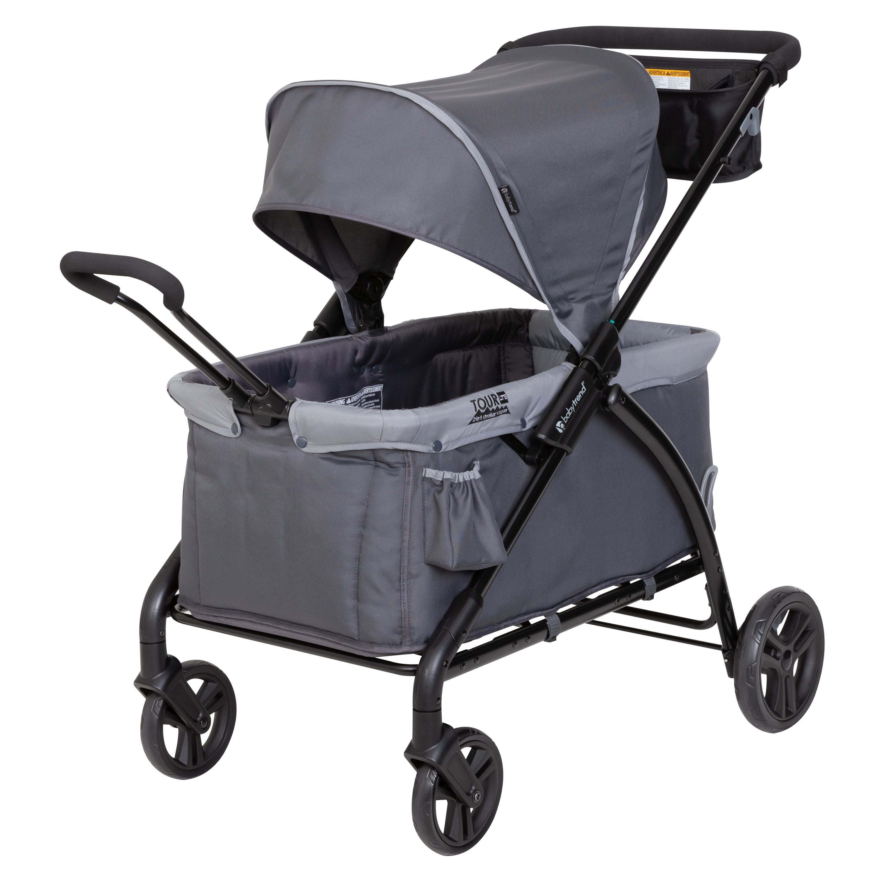Winner of the JPMA Innovation Award in the Stroller Category Super large Cargo Space with Built-in Seating for two, includes 3-point safety harness belt Ultimate Storage Solutions: includes parent organizer with 2 cup holders, center console with mesh pocket, 2 child cup holders outside of the wagon Extra-large ratcheting canopy with extended Visors for shade from the sun Flip up/down pull Handle easily allows the Tour to transform from a "push" stroller to "pull" a wagon mode Durable 9" rear and 7" front wheels Large and easy push brakes Compact flat fold for storage and travel